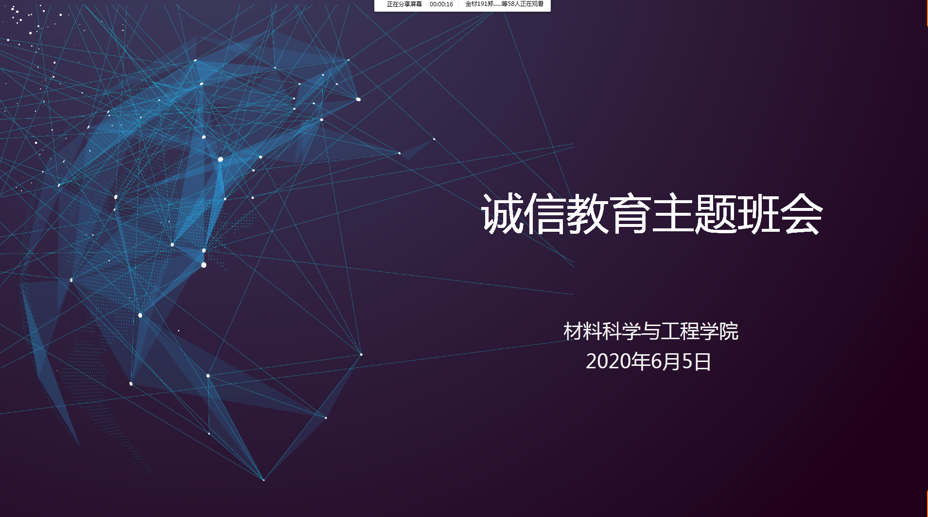 6月5日晚18:30,材料学院举行线上诚信教育主题会议,院志愿者团团长李子晗及2019级享受资助的学生参加了会议,会议由辅导员何超主持。 何超从“言而有信”、“行而有信”、“学而有信”、“研而有信”四个方面与同学们分享了对于诚信的理解,希冀同学们坚守法律和道德底线,在校园学习、生活中诚信做人、诚信处事。同时,他讲解了2019-2020学年获奖助学生反馈的工作要求,督促同学们认真总结上一学年的综合表现,劝勉同学们砥砺奋进,让大学时光充实起来,努力实现自己的目标。 李子晗介绍了院志愿者团概况及志愿者团长期开展的小学宣讲、绿植领养、冬衣义卖、武进汽车站志愿服务等活动,讲解了志愿小绿本的填写方式,并鼓励大家积极参加志愿服务活动,在志愿服务中提升自我、实现个人价值。 本次主题会议旨在加强学生对于诚信的理解,培养提升学生的诚信意识,号召同学们从我做起,从身边小事做起,共同营造诚实守信、风清气正的校园环境。