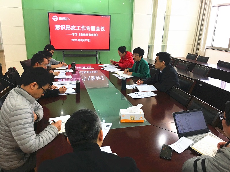 3月19日,为进一步做好意识形态工作,材料学院党委召开了专题会议,集中学习《宗教事务条例》。会议由院党委书记吕琳华主持。 会上,吕琳华通报了学院近期意识形态领域开展的工作,并对下一阶段可能出现的问题和风险点作出研判;其他人员结合工作实际提出意见和建议。会议要求,针对省委巡视反馈意见提出的意识形态工作责任制落实过程中存在的问题,学院要坚持问题导向,切实把落实整改作为进一步做好我院意识形态工作的思想自觉和行动自觉,以求真务实的工作态度,不折不扣地完成好整改工作。 会议集中学习了《宗教事务条例》,强调要认真学习贯彻习近平总书记关于宗教工作的重要论述,全面贯彻党的宗教工作基本方针,坚定信心、担当尽责,以高度的政治责任感和历史使命感,积极引导宗教与社会主义社会相适应,全面提升宗教领域治理体系和治理能力现代化水平。与会人员进行了讨论交流,大家一致认为,新修订的《宗教事务条例》全面贯彻了党的宗教基本方针,是对全国宗教工作经验的总结和升华,内涵十分丰富,是依法管理宗教事务,推动宗教工作法制化、规范化建设的重要措施,是做好新形势下宗教工作的重要保证。大家表示,将积极认真地贯彻落实,自觉做宣传者、执行者、捍卫者,做好学校相关工作,切实维护社会和学校的和谐稳定。