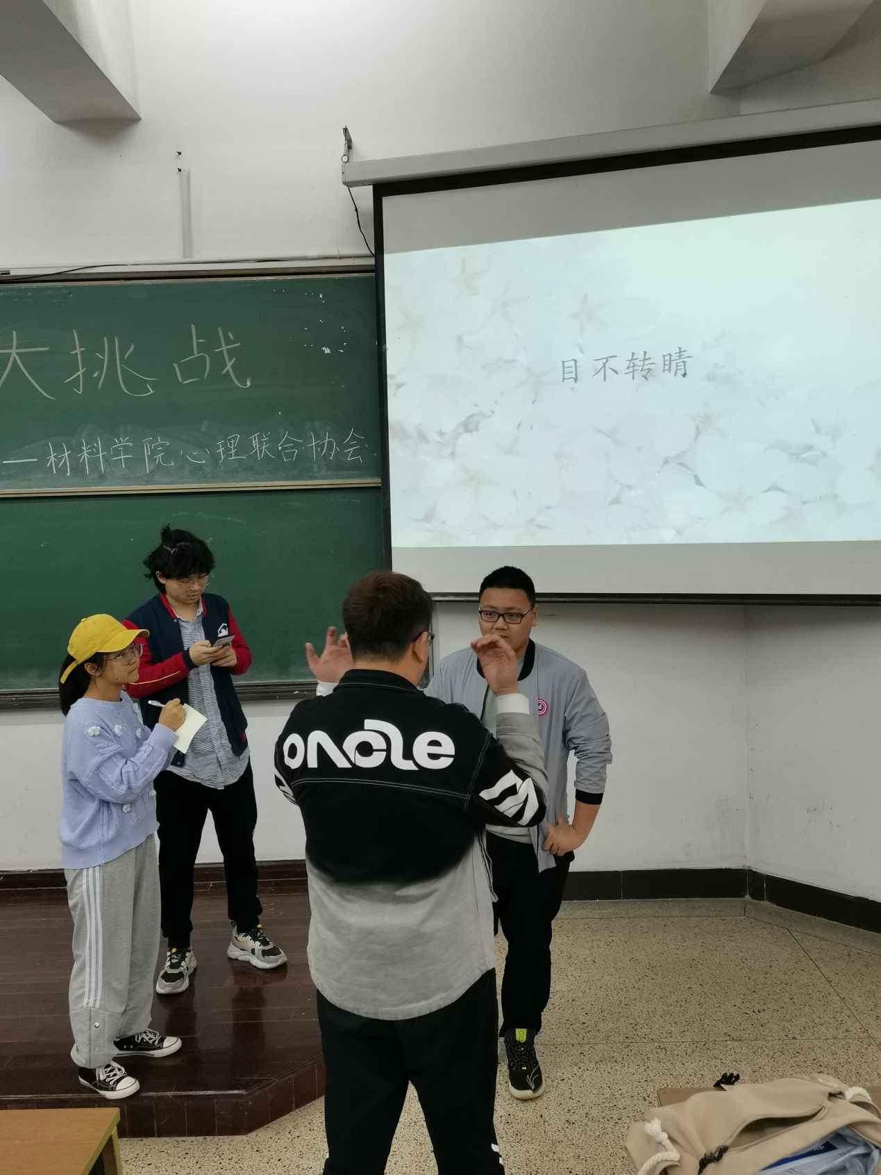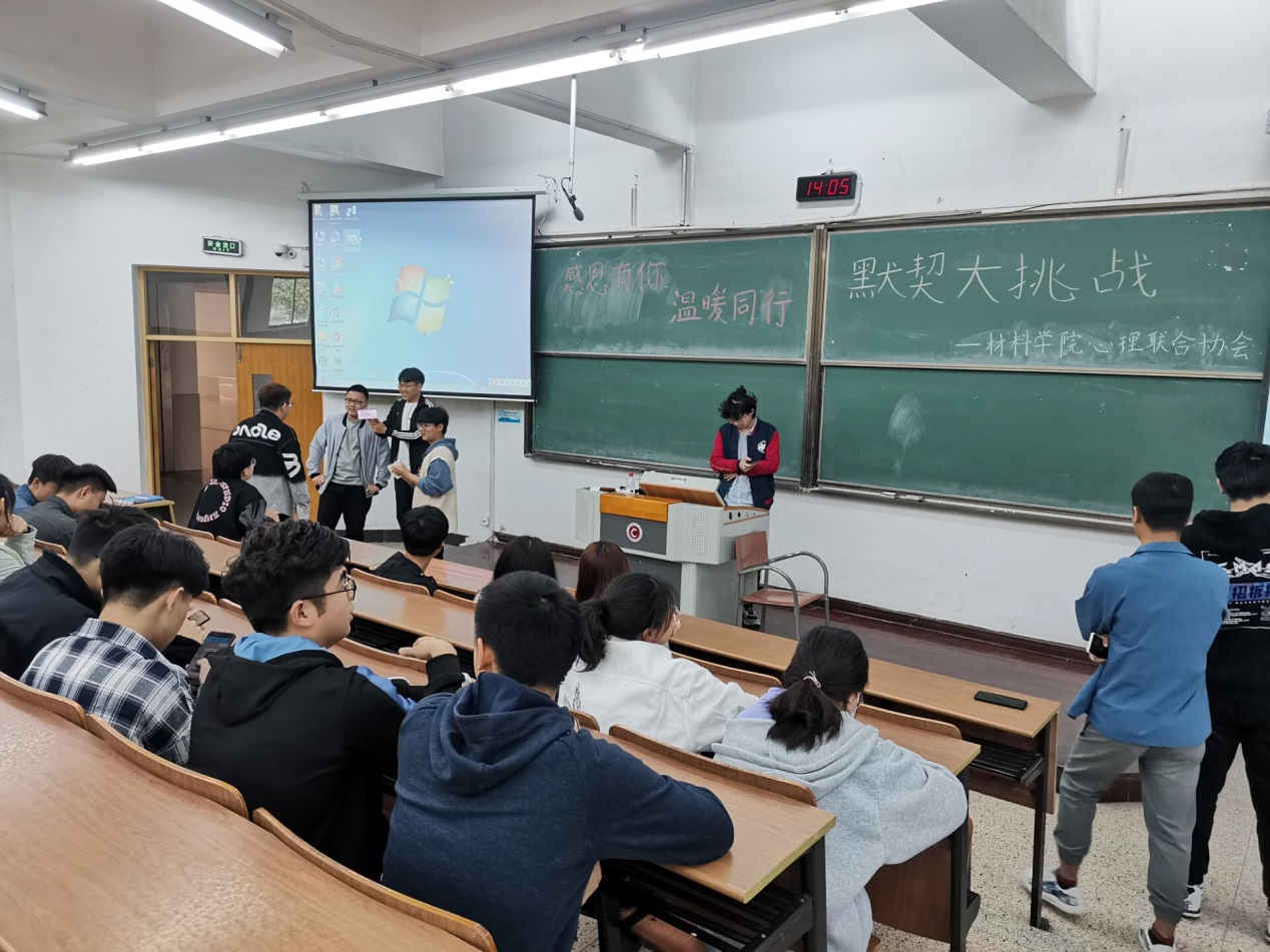 为增强材料学子之间的默契、沟通和配合,绽放青春绚丽的色彩,寻找心灵互通的伙伴;4月18日下午两点,材料学院心理联合协会在辅楼W10开展了“感恩有你,温暖同行”默契大挑战活动。此次活动由宣传部部长甘文东主持,组织部部长李燚及其心理联合会全体成员协助开展。 活动首先由宣传部部长甘文东向参赛队伍介绍比赛规则,比赛分三轮进行,第一轮限时四分钟,第二轮限时三分钟,第三轮限时两分钟;随后,比赛开始,组织人员带领参赛队伍到达指定地点,计时开始,同学们奇思妙想,以各种令人意想不到的动作和拟声向队友传达内容,活动有条不紊的进行着,同学们欢声笑语、乐在其中。现场氛围与材料学院心理联合会开展此次活动的初衷相呼应,旨在培养大家和朋友的默契与配合,以及结识更多的新朋友。最终,历时近三个小时,比赛结束,十支配合及其默契的搭档脱颖而出。 本次活动大大增强了心理联合会部员的活动组织能力,更重要的是增强了参赛队伍成员和同学之间的默契、交流和配合,营造了你帮我助、携手并进、砥砺前行的融洽氛围,为心理工作的有效开展提供了助力。