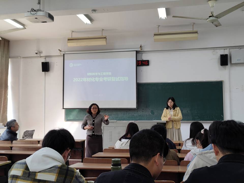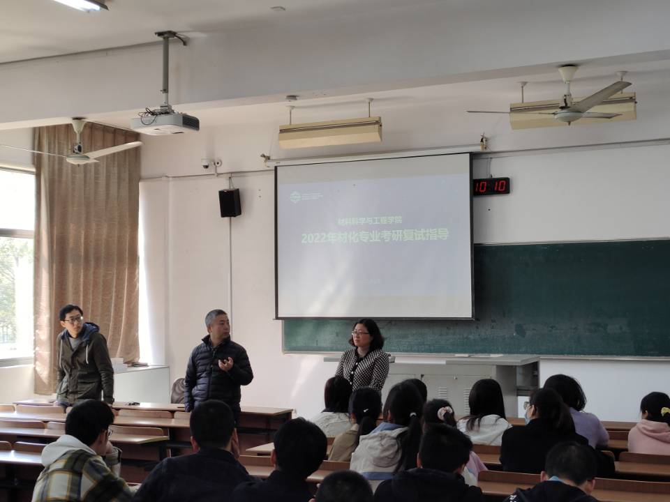 为了进一步加强同学们对考研复试调剂的认识,增强面试信心与技巧。2022年3月9日上午,材料化学专业于W1201举行2022材料化学专业考研复试指导会,辅导员李若洁老师主持会议,邀请材料学院院长助理王亚飞教授、材化教工党支部书记宋艳副教授、教研室盛扬副教授对同学们进行指导。会上老师对同学们复试指明学习方向,并对同学们提出的问题做出了全面专业的解答。