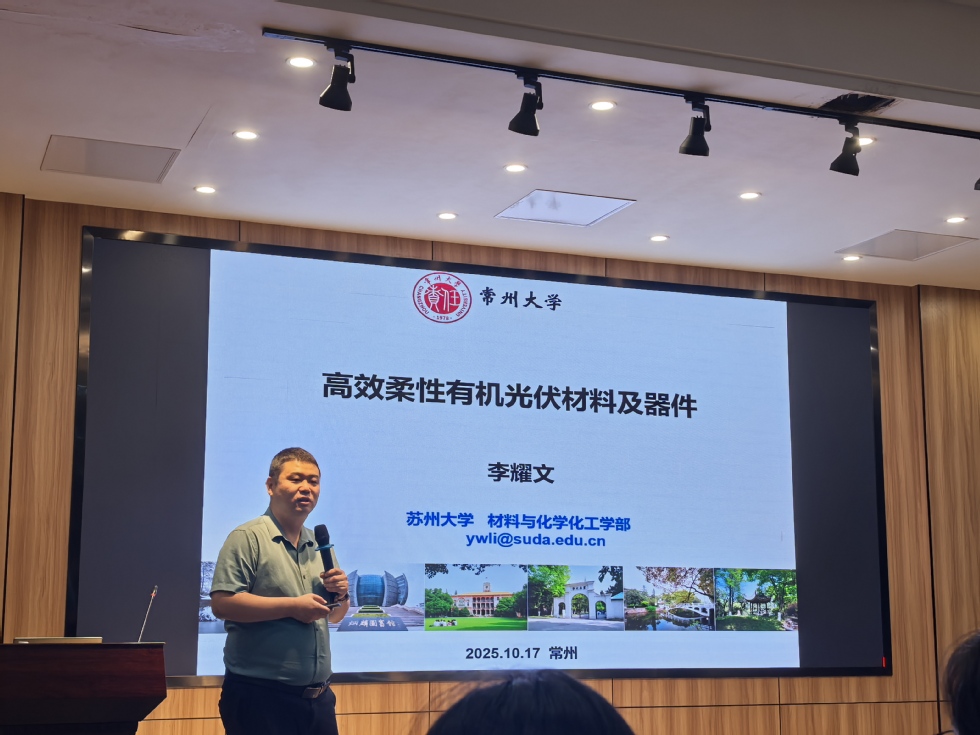 2025年10月17日下午,苏州大学科学技术研究院副院长李耀文教授应邀访问常州大学材料科学与工程学院,在一楼学术报告厅为学院师生带来了一场题为“柔性有机太阳能电池材料与器件”的精彩学术报告。本次报告会由材料学院副院长王亚飞教授主持,全院师生踊跃参加。 李耀文教授从提升柔性有机太阳能电池的光电性能出发,系统介绍了其团队在电极结构设计与活性层调控方面的创新性成果。针对银纳米线电极中导电性与透光率难以兼顾、弯折耐受性差等关键难题,他提出了“限域生长构筑电极微纳结构”与“分子模板”等策略,成功构建银纳米线-金属氧化物复合电极,显著增强了银纳米线间结点结合强度与电极整体导电性,从而实现了柔性有机太阳能电池器件在光、电、机械性能的协同提升,器件效率突破19.63%。此外,李教授还分享了其团队在发展大面积有机太阳能电池组件方面的最新进展。通过实施“客体分子模板”、“异相成核剂”、“快速固化策略”以及“结晶顺序调控”等一系列工程,有效调控了活性层分子结晶行为和成膜动力学,制备出效率超过18 %的高性能大面积组件,为柔性有机太阳能电池的制备提供了技术支撑。 在交流环节,李耀文教授结合自身科研经历,鼓励研究生在探索过程中保持坚韧不拔的意志与敏锐的科学洞察力,注重挖掘实验现象背后的深层机制。报告结束后,现场师生踊跃提问,李教授就相关问题进行了细致深入的解答,现场学术氛围浓厚。整场报告内容前沿、视角新颖,不仅有效效拓宽了师生的学术视野,也进一步激发了大家对柔性有机太阳能电池领域的科研热情。