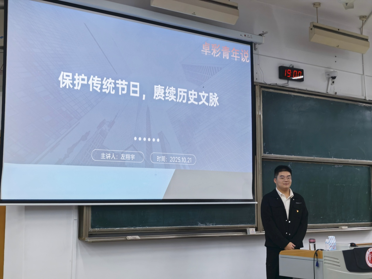 10月21日晚,“卓彩青年说”系列主题团课在 W15 阶梯教室开讲,本科生预备党员左翔宇担任主讲人。 本次团课以《保护传统节日,赓续历史文脉》为题,从传统节日的文化内涵切入,结合实例分析传统节日在当代的挑战与机遇,指出保护传统节日需理解精神内核,实现创造性转化与创新性发展,呼吁青年做传统节日的传承者与实践者。 本次团课反响热烈,同学们表示加深了对传统节日重要性的理解,激发了民族文化认同感与自豪感,未来将担当文化传承责任,为增强文化自信贡献青春力量。