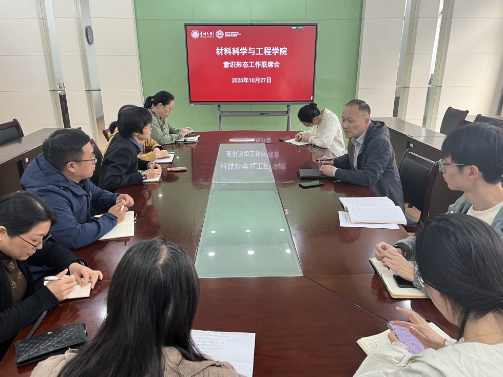 2025年10月27日下午,材料学院党委在材料楼406会议室召开第三季度意识形态工作联席会。学院党委书记储志新、全体科级干部和党支部书记参加会议。 各科级干部和党支部书记依次就分管领域及所在支部近期开展的意识形态工作、存在的问题和发现的风险隐患及整改建议进行了交流发言。 储志新强调,当前意识形态工作复杂多变,风险挑战不容忽视,大家要持续深化理论武装,筑牢意识形态安全防线,抓牢关键环节,守好重点阵地,维护好校园安全稳定。
