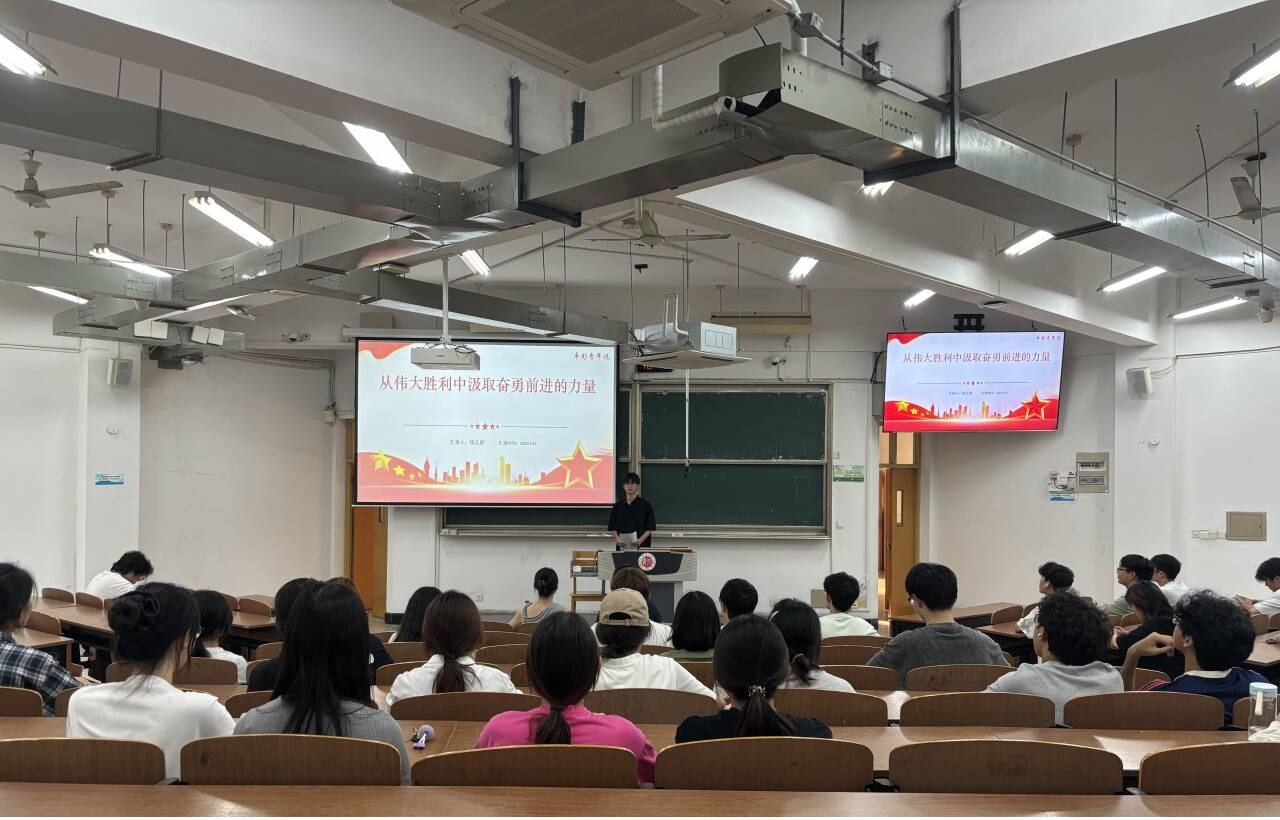 9月15日,“卓彩青年说”系列团课在W17 阶梯教室开讲,本科生预备党员钱正康以《从伟大胜利中汲取奋勇前进的力量》为题担任主讲人。 团课围绕中国人民抗日战争暨世界反法西斯战争胜利80 周年展开,回顾日本侵华战争的灾难,讲解抗战胜利意义及党在其中的中流砥柱作用等,还阐释伟大抗战精神内涵。 主讲人强调铭记历史是为开创未来,需从抗战史中汲取力量,激励青年将爱国情怀转化为动力,以坚定信念和过硬本领投身强国建设、民族复兴伟业。
