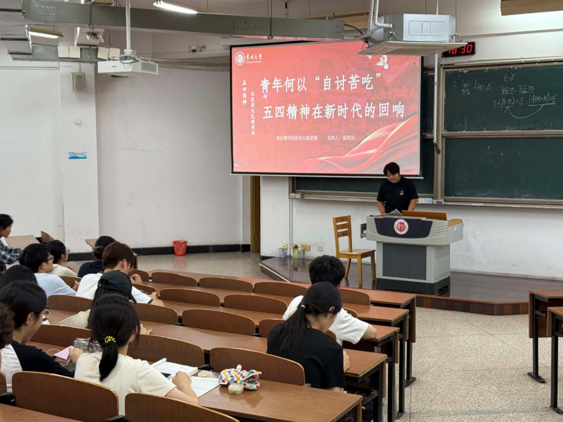 9月18日,“卓彩青年说”系列团课顺利开讲,主讲人为材料233班侯思羽,她以《青年何以‘自讨苦吃’—— 五四精神在新时代的回响》为题,吸引众多学子参与。 团课先回顾“九一八事变” 历史,强调勿忘国耻、奋发图强;再以五四精神为主线,结合航天工匠等事迹及河南暴雨等灾害中的青年志愿行动,从“破圈”、“较真”、“共燃”三维度阐释青年践行五四精神的路径。 主讲人倡议让五四精神在当下发光,同学们纷纷表示将坚定信念、锤炼本领,为民族复兴贡献青春力量。