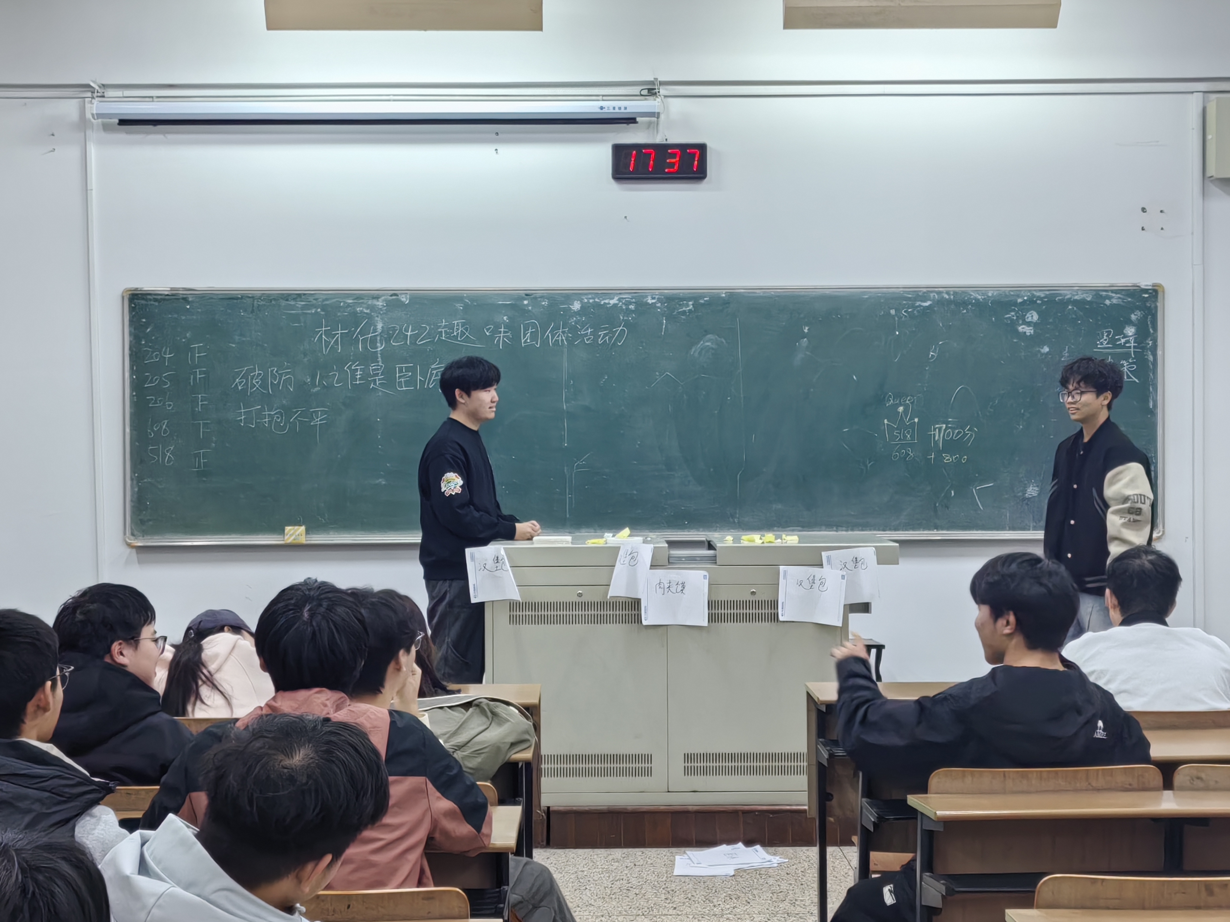 11月20日,材化242在教室成功举办了一场别开生面的趣味游戏活动。 本次活动精心准备了多个互动游戏项目,包括谁是卧底、你画我猜、听歌识曲等经典游戏。 在“谁是卧底”中,同学们用语言编织着真相与谎言的迷宫,用智慧破解着彼此设下的谜题,在欢笑中拉近了心与心的距离。到了“你画我猜”,大家用夸张的动作和生动的神情表达词语,引得现场阵阵爆笑。最后,全体同学纷纷彰显自己的听歌功底,音乐一响即被秒杀。 通过这次活动,班级凝聚力得到了进一步增强,同学们纷纷表示期待下次活动的到来。大家一致认为,这样的活动不仅缓解了学习压力,更让班级氛围变得更加融洽和谐。 一审/王敏 二审/汪称宇 三审/程晓军