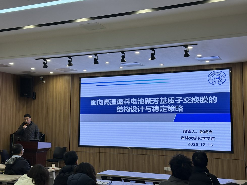 2025年12月15日,吉林大学赵成吉教授应邀访问常州大学材料科学与工程学院,并为师生作题为“面向高温燃料电池聚芳基质子交换膜的结构设计与稳定策略”的学术报告。报告在材料学院一楼报告厅举行,由学院副院长林本才教授主持,全院师生踊跃参加。 赵成吉教授长期致力于低成本、高性能聚合物电解质膜材料的分子设计、构效关系及膜电极组装集成技术研究,并将其应用于高性能燃料电池、电解水制氢、液流电池等电化学器件。报告中,他首先介绍了高温质子交换膜的研究现状与关键科学问题,系统阐述了其团队近期取得的重要进展。团队开发了一系列新型功能性自聚微孔聚合物,旨在替代传统PBI/PA膜并优化高温质子交换膜的综合性能。通过分子层面的创新设计有效的抑制磷酸的流失,提高了高温质子交换膜的质子传导率、增强了膜的化学稳定性,在燃料电池低温冷启动等方面实现新突破。 报告结束后,赵成吉教授与现场师生进行了亲切交流,并就相关学术问题展开了深入探讨。本次报告内容翔实、视角前沿,有效拓展了师生在高温质子交换膜领域的研究视野,也激发了大家对新能源材料与器件创新的积极思考。