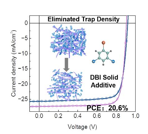 近日,我校朱卫国团队宋欣教授等人在有机太阳能电池(OSCs)领域取得重要研究进展。提出一种基于挥发性固体添加剂的双相调控新策略,成功解决活性层给体自组装不足与受体过度聚集的核心难题,显著提升器件效率与稳定性,为高效长寿命有机光伏器件的研发提供了可推广路径。 有机太阳能电池因其柔性、半透明、可溶液加工、低成本制备等优势,在柔性电子、光伏建筑一体化等领域具有广阔的应用前景,是新能源领域的研究热点。然而,活性层中给体分子自组装能力不足、受体分子过度聚集的问题,往往会引发陷阱态密度升高,造成严重的非辐射复合损失,成为制约器件效率进一步提升的关键瓶颈。 目前相关研究主要聚焦于单一受体相的调控,如何实现给体与受体两相协同优化,从源头上降低能量无序性与陷阱态密度,仍是亟待突破的技术难题。朱卫国团队宋欣教授创新性地引入具有多重非共价相互作用的挥发性固体添加剂1,3-二溴-5-碘苯(DBI),构建了高效的给体与受体相的同步调控体系,显著提升了器件性能与稳定性。研究结果显示:在经典PM6:Y6二元体系中,经适量DBI处理后,器件的光伏效率从17.0%提升至18.4%,同时陷阱态密度显著降低,最佳条件下陷阱密度降至约6.75×1015 cm−3,器件载流子寿命显著延长、复合速率明显降低。值得关注的是,该调控策略具有优异的普适性。在PM6:L8-BO:L8-BO-F三元体系中,DBI的引入进一步将器件效率推高至20.6%,同时大幅提升了器件的运行稳定性,在连续光照条件下,器件寿命T80 达到 769 h,为构筑高效率、长寿命有机光伏器件提供了新的可推广路径。